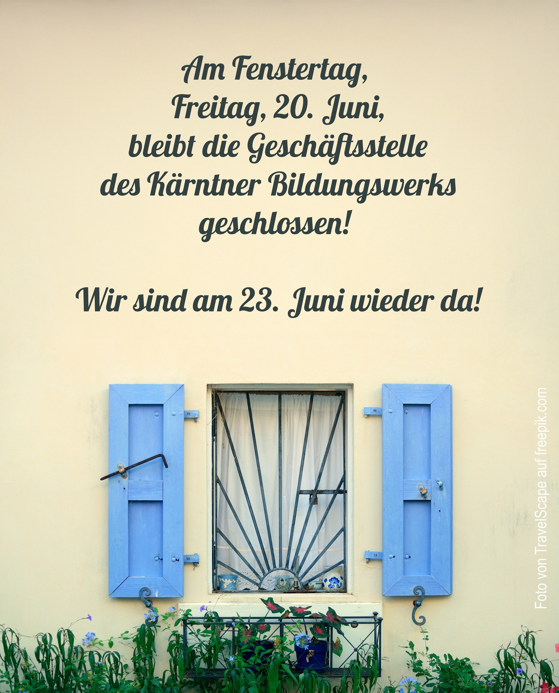 Geschäftsstelle am 20. Juni geschlossen Am Fenstertag, Freitag, 20. Juni, bleibt die Geschäftsstelle des Kärntner Bildungswerks geschlossen! Wir sind am 23. Juni wieder da!