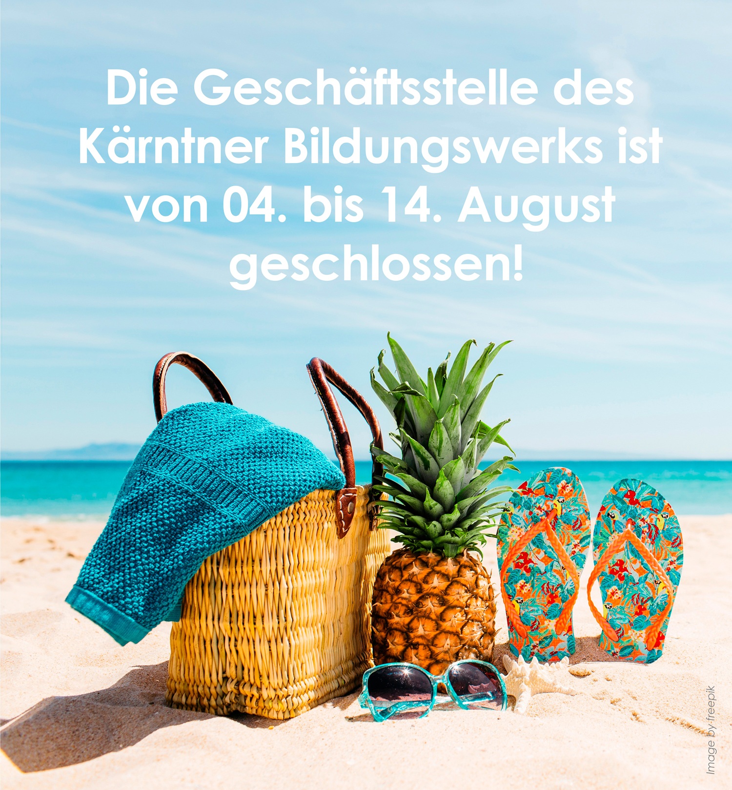 Sommerzeit im Kärntner Bildungswerk Geschäftsstelle von 04. bis 14. August geschlossen! Individuelle Urlaubszeiten: Michael Aichholzer: 28.07- 14.08Doris Rottermanner: 28.07- 20.08Andrea Koppitsch & Claudia Schwarz: 04.…