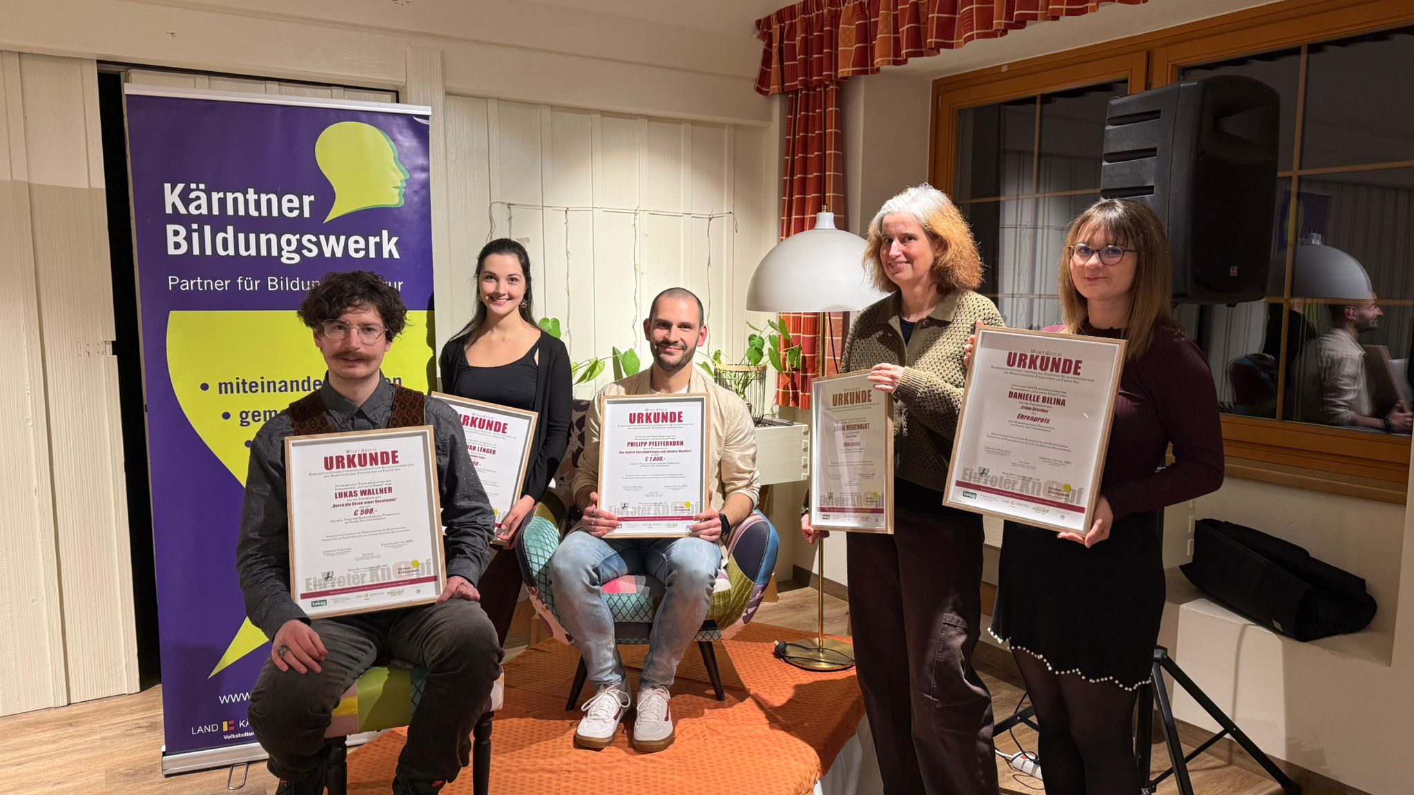 Foto v.l.n.r.: Lukas Wallner (Platz 2), Hannah Lenger (3. Preis & Publikumspreis), Philipp Pfefferkorn (1. Platz), Sonja Heidenblut (Ehrenpreis), Danielle Bilina (Ehrenpreis) (c) Kärntner Bildungswerk
