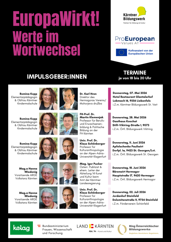 Im Rahmen des diesjährigen Aufrufs zur Einreichung von Aktivitäten zur Stärkung von Demokratie, Rechtsstaatlichkeit und EU-Werte des Konsortiums “ProEuropeanValuesAT” erhielt das Kärntner Bildungswerk eine Finanzierungszusage für das eingereichte Projekt „EuropaWirkt! Werte im Wortwechsel“.