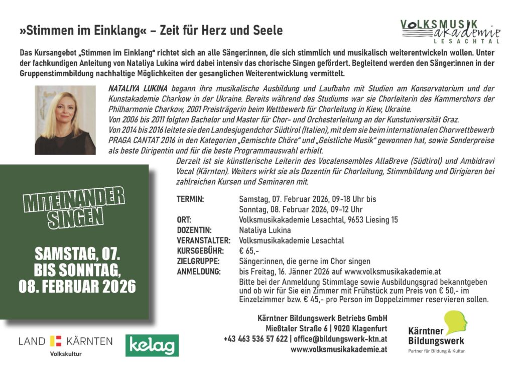07feb(feb 7)9:0008(feb 8)12:00Stimmen im EinklangVolksmusikakademie Lesachtal