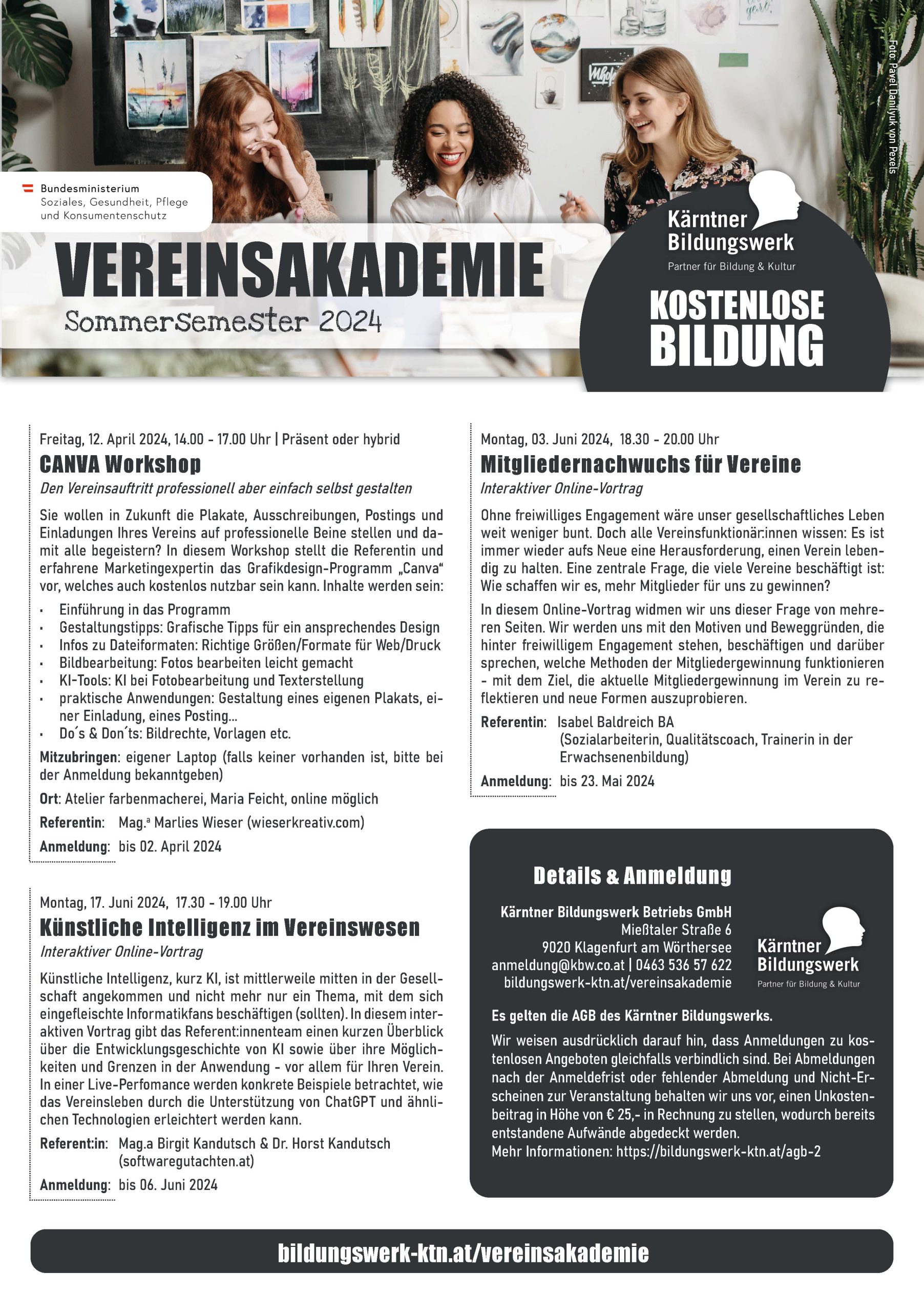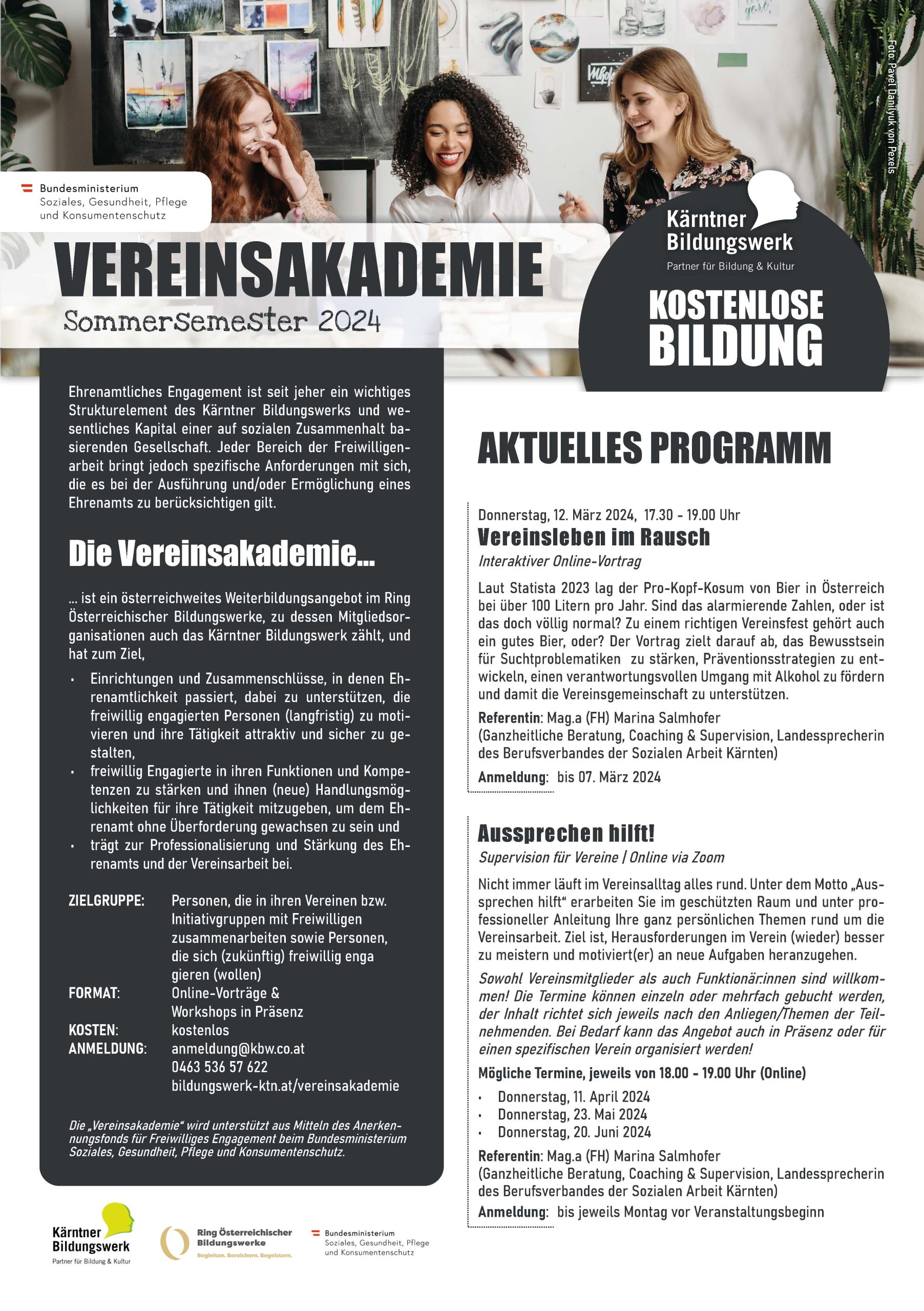 Kürzlich wurde das Programm für das Sommersemester 2024 der Vereinsakademie veröffentlicht. Neben der Möglichkeit, Supervision für Vereine in Anspruch zu nehmen, werden Online-Vorträge zu den Themen Alkohol im Vereinsleben, Künstliche Intelligenz und Mitgliederzuwachs für Vereine angeboten.